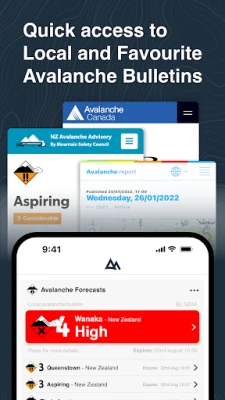 Avalanche bulletins will automatically be retrieved for the local area your in and you can save your favourite avalanche bulletins for 1 click access on the home screen.
