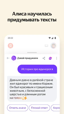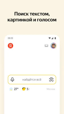 Быстрый поиск с умными подсказками и Алиса, которая ответит на любой вопрос. Ищите в Яндексе так, как вам удобно: текстовым запросом в строке поиска; голосом — здесь поможет Алиса; по фото, картинке и объектам окружающего мира — в Умной камере. А ещё приложение подскажет, кто звонит с незнакомого номера, поможет сэкономить на дорогих покупках, разобраться в сложных вопросах и решать другие повседневные задачи.