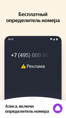 Бесплатный автоматический определитель номера. Включите АОН в меню настроек или попросите: «Алиса, включи определитель номера». Он покажет, кто звонит, даже если номера нет в контактах. База данных из более 5 миллионов организаций и отзывы пользователей сэкономят время и защитят от нежелательных разговоров.